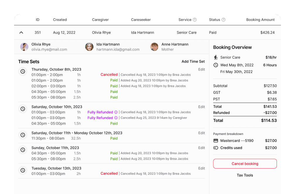 Every persona had a clear view of their side of the system: careseekers saw what they owed, caregivers saw their upcoming payouts, and staff tracked payments, bookings, and KPIs in real time. A consistent design system tied all these workflows together, ensuring complex processes were intuitive and scalable.
