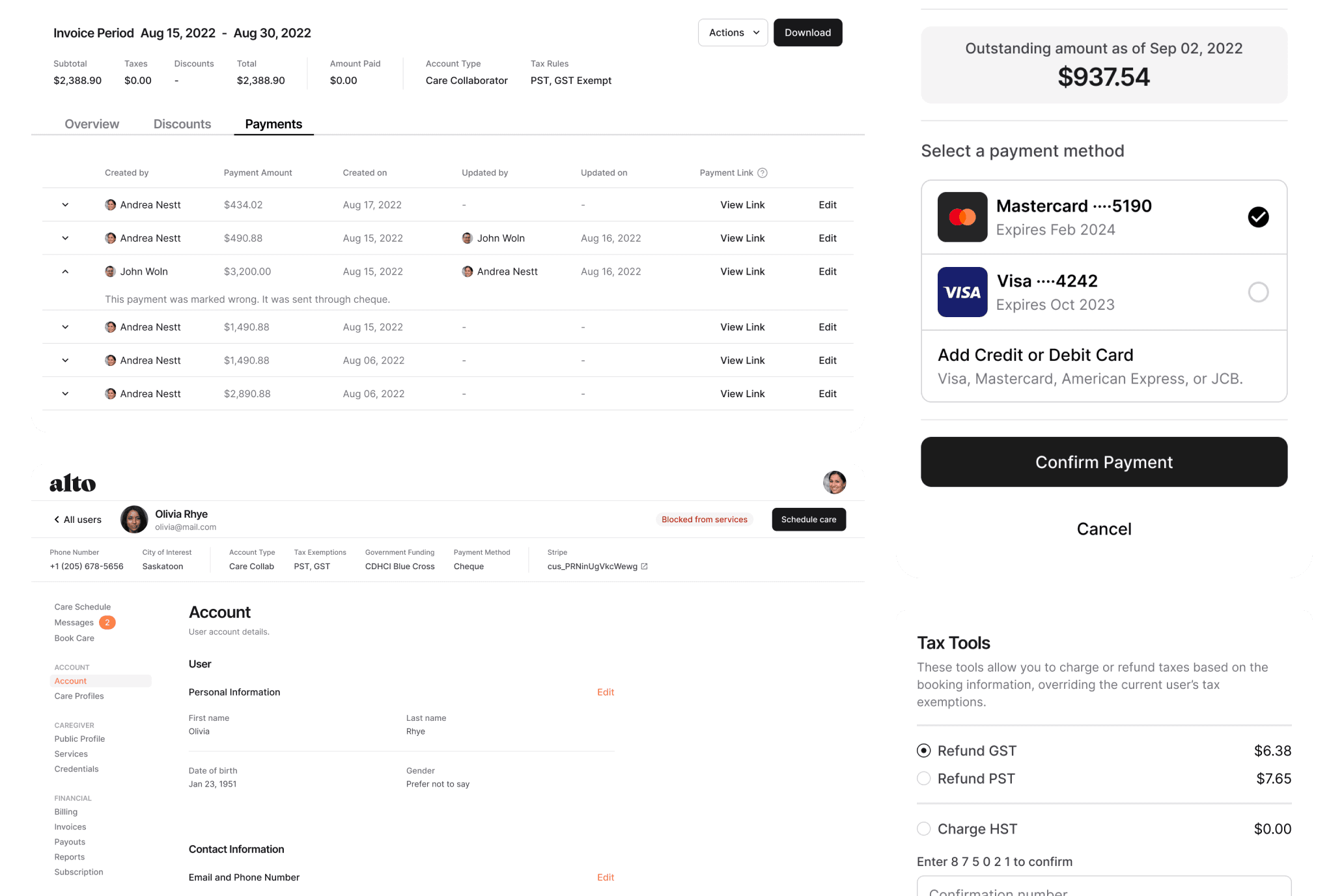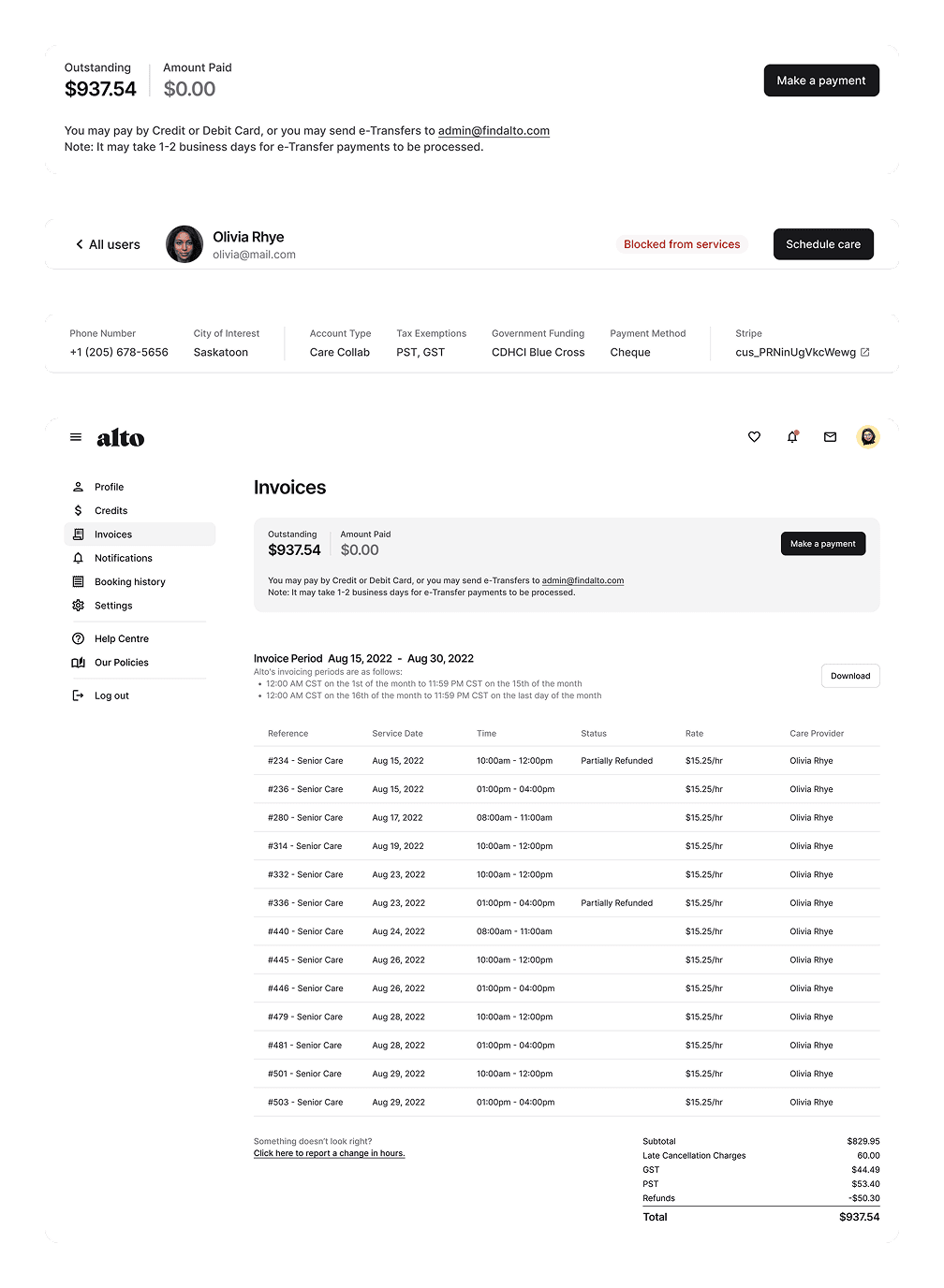 Invoices were sent directly to careseekers, who could make partial or full payments via credit card, cheque, or e-transfer. Operations staff retained control to review, adjust, and resolve disputes before invoices went out.